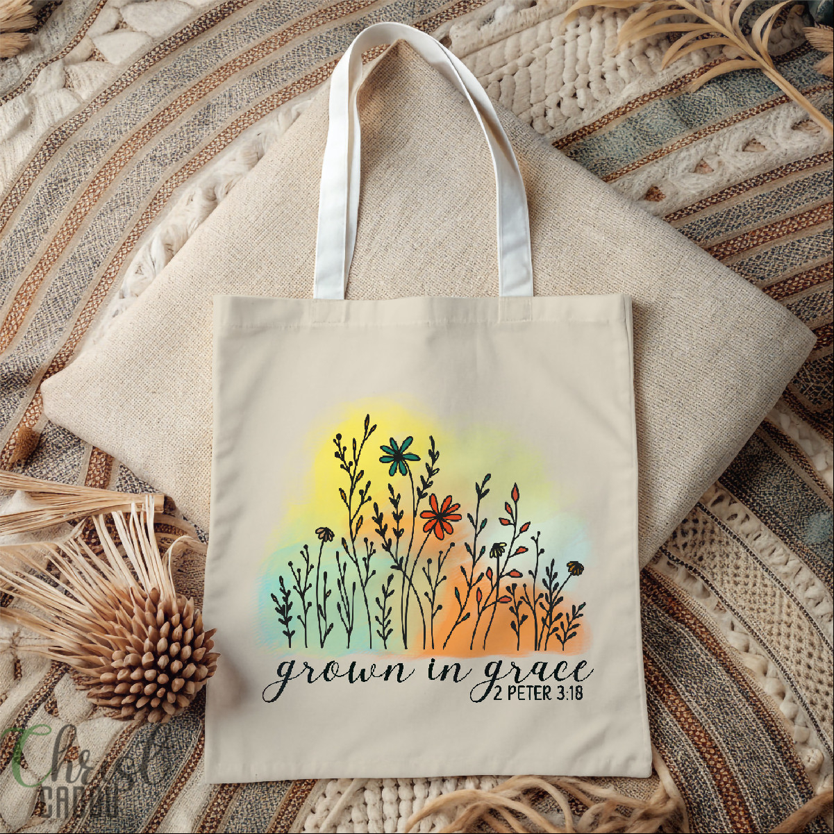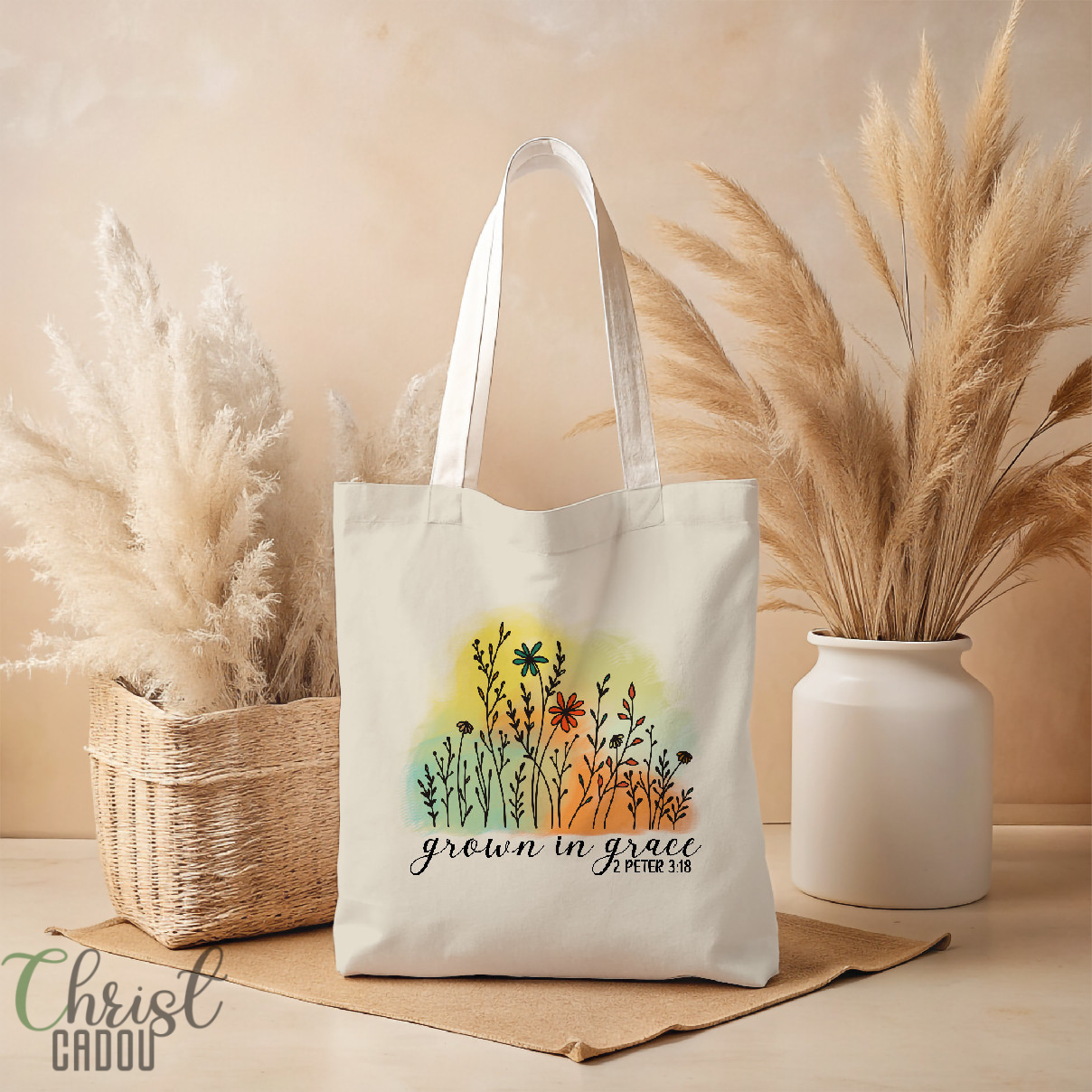 Ez a gyönyörű vászon szatyor akvarell háttérrel és finoman megrajzolt vadvirágokkal nemcsak praktikus, hanem üzenetet is közvetít: „grown in grace” – nőjünk a kegyelemben, nap mint nap.A  keresztény üzetetű bevásárló táska, ideális bevásárláshoz, sétához, mindennapi használatra. Praktikus, könnyen mosható, és sok dolog belefér.